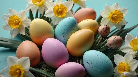 AI Generated. Easter pastel background with colorful easter eggs and daffodils