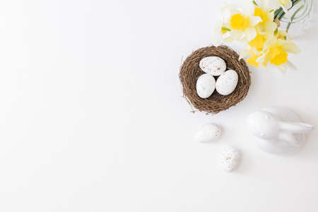 Flat lay easter composition with daffodils in a vase and eggs on white background