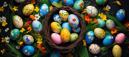A vibrant collection of colorful Easter eggs nestled among delicate flowers in a sunny spring meadow, evoking a sense of joy and celebration.