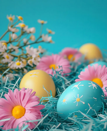 Pastel Easter eggs and daisies create a beautiful spring scene.