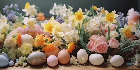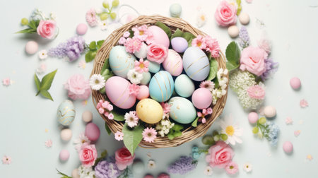Beautifully arranged pastel Easter eggs surrounded by delicate flowers and greenery, perfect for celebrating spring and the joy of the season in a serene garden setting.