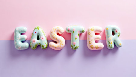 Colorful letters spelling Easter are showcased in pastel hues with floral decorations against a soft gradient background. The cheerful display is ideal for spring celebrations.