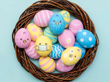 Pandemic Easter. Festive ornament. Homemade food decoration. Colorful painted eggs in face mask with chicken bunny modern minimal design set in basket isolated on blue conceptual background.