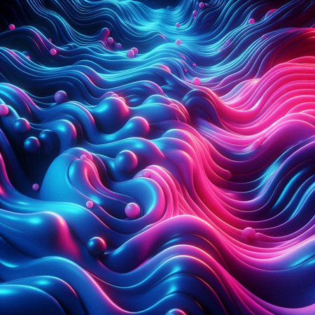 Vibrant abstract fluid waves in brilliant neon colors create a stunning textured background visualization showcasing complex interwoven strands of magenta orange and cyan blue tones against a deep violet backdrop suggesting dynamic movement organic forms and futuristic energy suitable for digital wallpaper or creative graphic design projects emphasizing intense saturation and smooth flowing lines that capture immediate visual interest and depth across the composition.