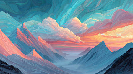 Fantasy landscape with mountains and clouds. Digital painting. Vector illustration.