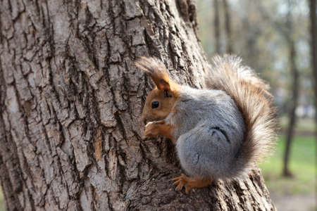 Squirrel on a tree in the forest in spring, close-up