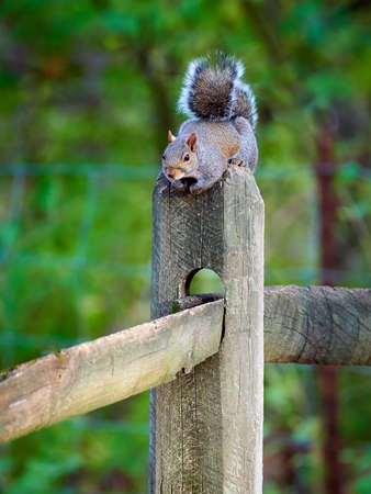 Portrait of a curious grey squirrel standing on a garden fence, UK.