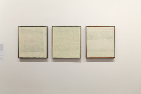 Wassenaar, Netherlands - June 28, 2025: Installation of blank canvases on wall at Voorlinden museum