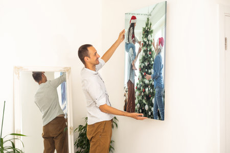 Canvas print with gallery wrap. Woman hangs photography on white wall. Hands holding photo canvas print.