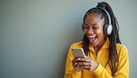 A young Black woman in a vibrant yellow jacket smiles widely while listening to music on her smartphone. Her joyful expression radiates happiness, capturing the pure delight of music and connection.