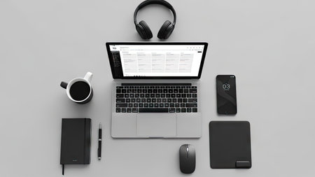 An organized workspace showcases a laptop, smartphone, and headphones. Additional elements include a planner, pen, coffee cup, and a small potted plant. The setting appears bright and modern with neutral colors. Suitable for illustrating technology, business, or lifestyle themes.