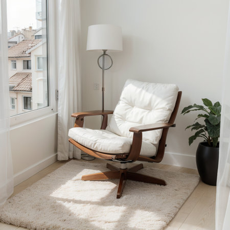 A well-lit interior scene featuring a modern armchair, wooden table, and sideboard. The room is bathed in warm sunlight filtering through sheer curtains. The composition emphasizes clean lines and a minimalist aesthetic. This image would be suitable for commercial use in home decor or lifestyle publications.
