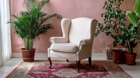 A stylish armchair is positioned in a warm, inviting living room with soft pink walls. Lush houseplants enhance the cozy atmosphere, while a richly patterned rug adds charm to the space.