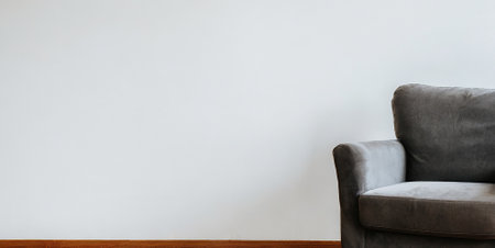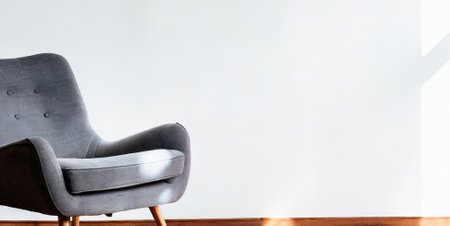 Grey armchair in a room with a white wall and copy space