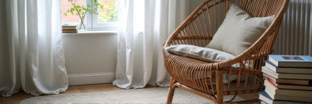 Cozy sunlit reading nook with rattan chair and stack of books by a bright window. That the image is generated using AI.