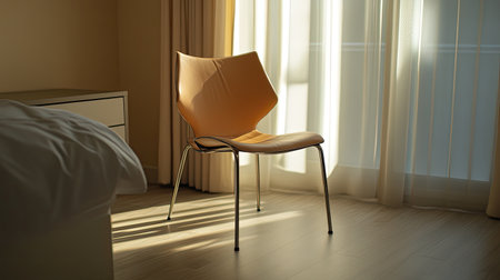 A stylish modern chair placed in a serene interior with gentle natural light streaming through soft curtains, creating a warm and inviting space.