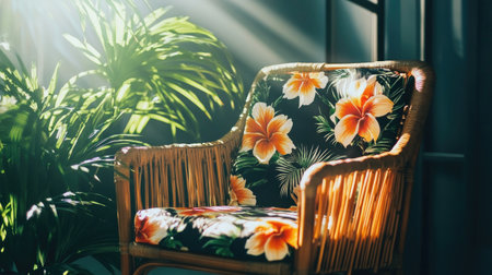 A beautifully designed rattan chair features a vibrant floral cushion, illuminated by soft sunlight, set against a backdrop of lush indoor plants, creating a cozy ambiance.
