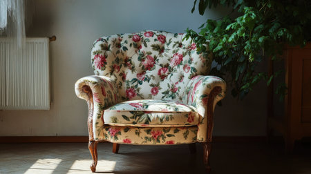 A charming floral armchair bathed in natural light, creating a warm and inviting atmosphere. Perfect for adding style and comfort to any interior.