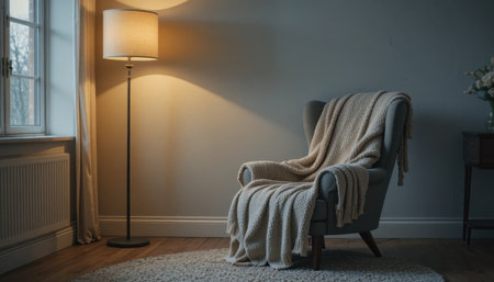 A serene living space featuring a soft armchair, warm floor lamp, and a knitted blanket enhancing comfort.