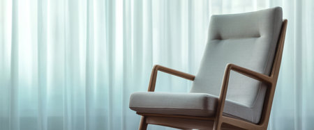 A stylish chair with a wooden frame and soft upholstery is placed near sheer curtains. The calming atmosphere suggests a peaceful reading nook or relaxation space inviting comfort and tranquility.