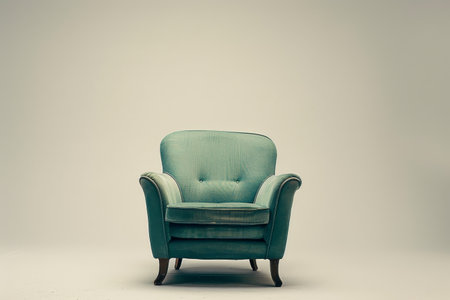 A retro teal armchair is centered in a minimalist space.