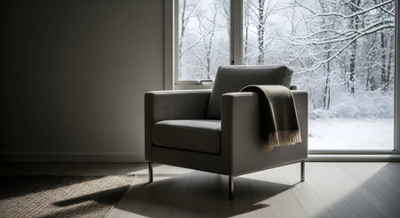 A cozy modern grey armchair sits in a minimalist room facing a large window with a scenic view of a snowy winter forest. A soft green blanket is draped over the chair, inviting relaxation and warmth against the cold outdoor scene.