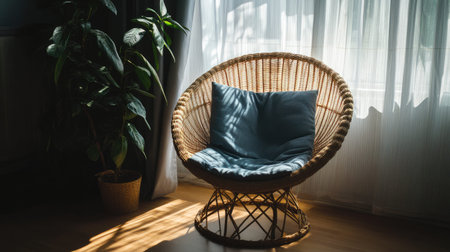 A cozy rattan chair adorned with a soft blue cushion is bathed in warm sunlight, creating a serene indoor atmosphere perfect for relaxation.