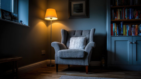 Discover a cozy reading nook featuring a stylish armchair and a warm floor lamp, creating a serene atmosphere perfect for relaxation at home.