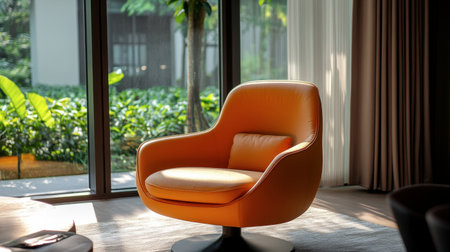 An elegant modern orange armchair situated by a large window, inviting natural light into the stylish interior space. Perfect for relaxation and aesthetic appeal.