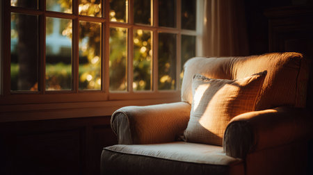 A cozy armchair softly illuminated by warm sunlight streaming through the window creates an inviting atmosphere in a serene living room setting.