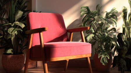 This beautiful retro armchair, adorned with rich fabric, sits amidst vibrant indoor plants, highlighting a serene and inviting atmosphere perfect for relaxation.
