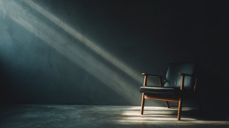 A striking modern leather chair sits in a minimalist room, enhanced by dramatic lighting that creates captivating shadows, ideal for showcasing sleek interior design.