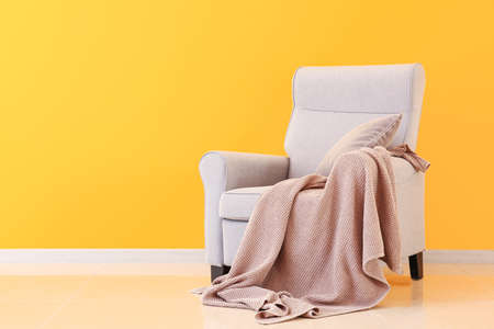 Chair with knitted plaid near color wall
