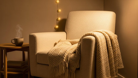 An inviting armchair draped with a textured knitted blanket sits beside a small wooden side table holding a steaming mug and a stack of books. A string of warm, glowing fairy lights hangs in the background, casting a soft, ambient glow. The scene evokes a sense of comfort, warmth, and relaxation, a cozy evening indoors. The lighting is warm and inviting, highlighting the textures of the fabric and the steam rising from the drink.