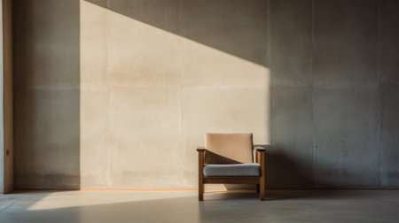 Warm sunlight illuminating a minimalist corner with wooden armchair and plant, creating a cozy and relaxing atmosphere