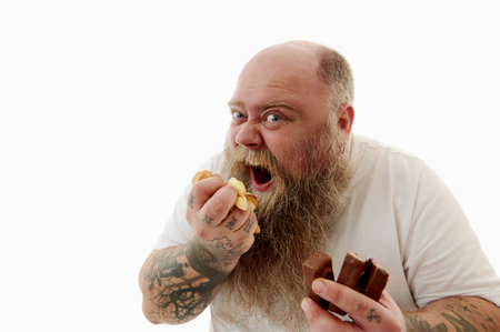 fat man eating, portrait of overweight person feels hungry and eating chips,cake,green tea frappe seated on armchai, isolated on white background with clipping path