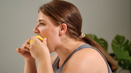 Concept food good healthy for weight loss. Smile obesity plus size women eat fresh tomato while standing beside window in the room. Fat female holding glass bowl salad vegetarian at home. Select focus