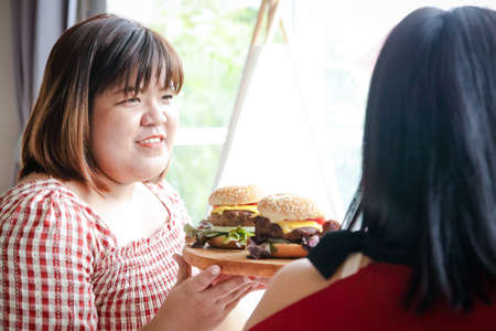 Fat Asian Couple Smile Happy Hold the hamburger together. Eating concept Health, weight loss