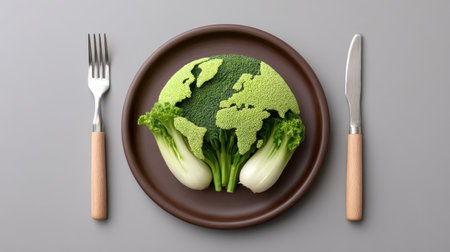 Unique representation of broccoli shaped like a globe on a plate, highlighting the importance of nutrition and sustainability in our diets. Perfect for eco-conscious culinary themes.