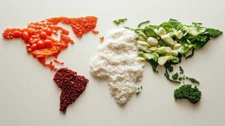 A stunning representation of a world map crafted from vibrant vegetables and rice. This artistic food display showcases healthy ingredients in a creative layout, perfect for culinary themes.