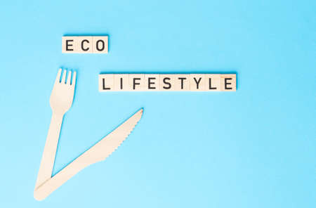 ECO LIFESTYLE sign made by wooden cubes with wooden cuttlery