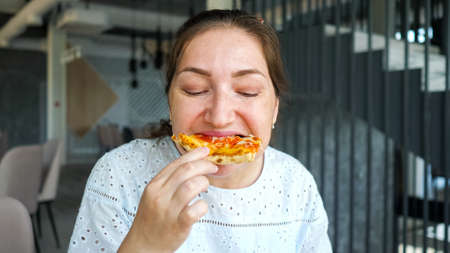 Young woman eats tasty pizza enjoying in cafe, close-up