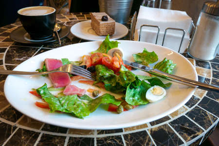 Nicoise salad made of fresh tuna slices, lettuce, hard-boiled eggs and vegetables on white plate, being eaten with fork and knife