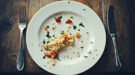 Overhead shot of a white plate with leftover rice, tomatoes, and herbs, accompanied by a fork and knife on a rustic wooden table, suggesting a finished meal.