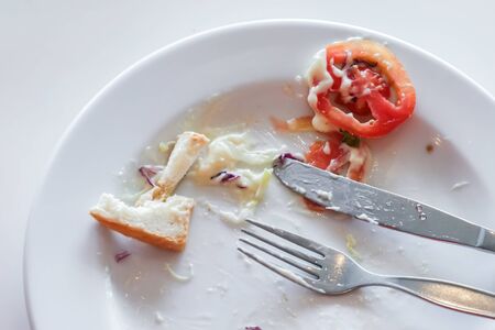 leftovers, closeup empty and dirty plate on the breakfast table. leftovers of breakfast or lunch table