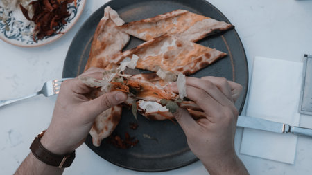 Female hands holding fork and knife to cut a slice of pizza on white plate, selective focus