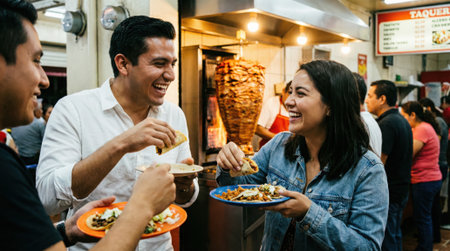 A group of happy young friends enjoying a lively evening meal of traditional tacos from a street food vendor in Mexico. They are laughing and socializing together.