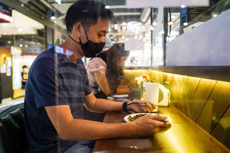 Asian man eating lunch separated with acrylic partition. Customers having dinner at restaurant with infection prevention measure during COVID-19 coronavirus pandemic.