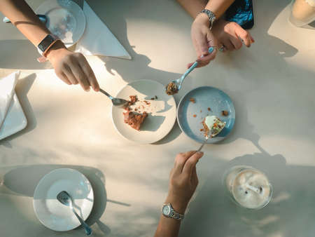 Drinking coffee and eating desserts together. Top view of hands of three beautiful women holding plates with delicious cakes desserts in cafe. Meeting of best friends. Coffee with cakes