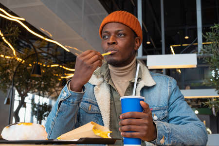 Sedvich in the hands of a close-up. A positive man eats a hamburger in a stylish, light, fast food restaurant